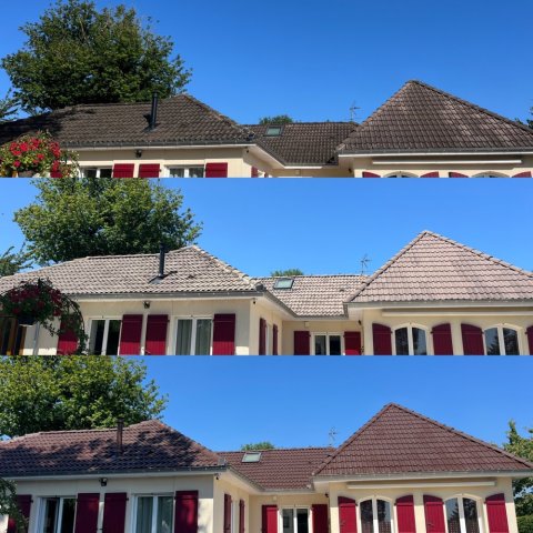 l'entreprise a procédé au nettoyage de l'ensemble de la toiture à remplacer les tuiles détectueuses et ainsi que l'application d'une résine colorée pour redonner l'étanchéité et l'aspect de la toiture